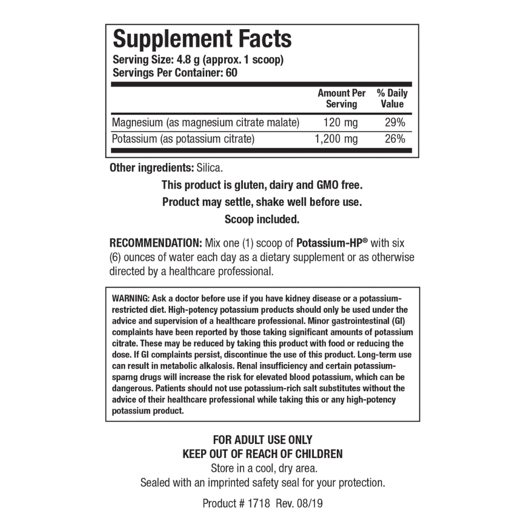 Potassium HP™ with Magnesium provides easily absorbable forms of potassium and magnesium to support muscle, nerve, and cardiovascular health. This gluten, dairy, and GMO-free formula promotes overall well-being and electrolyte balance with every scoop.