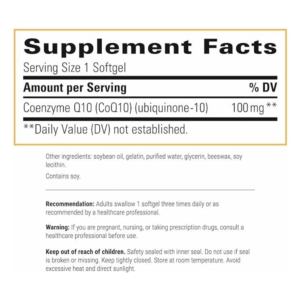 This supplement delivers 100 mg of highly bioavailable CoQ10, a key nutrient for energy generation at the cellular level and antioxidant protection, all in a soy-based softgel for enhanced absorption.