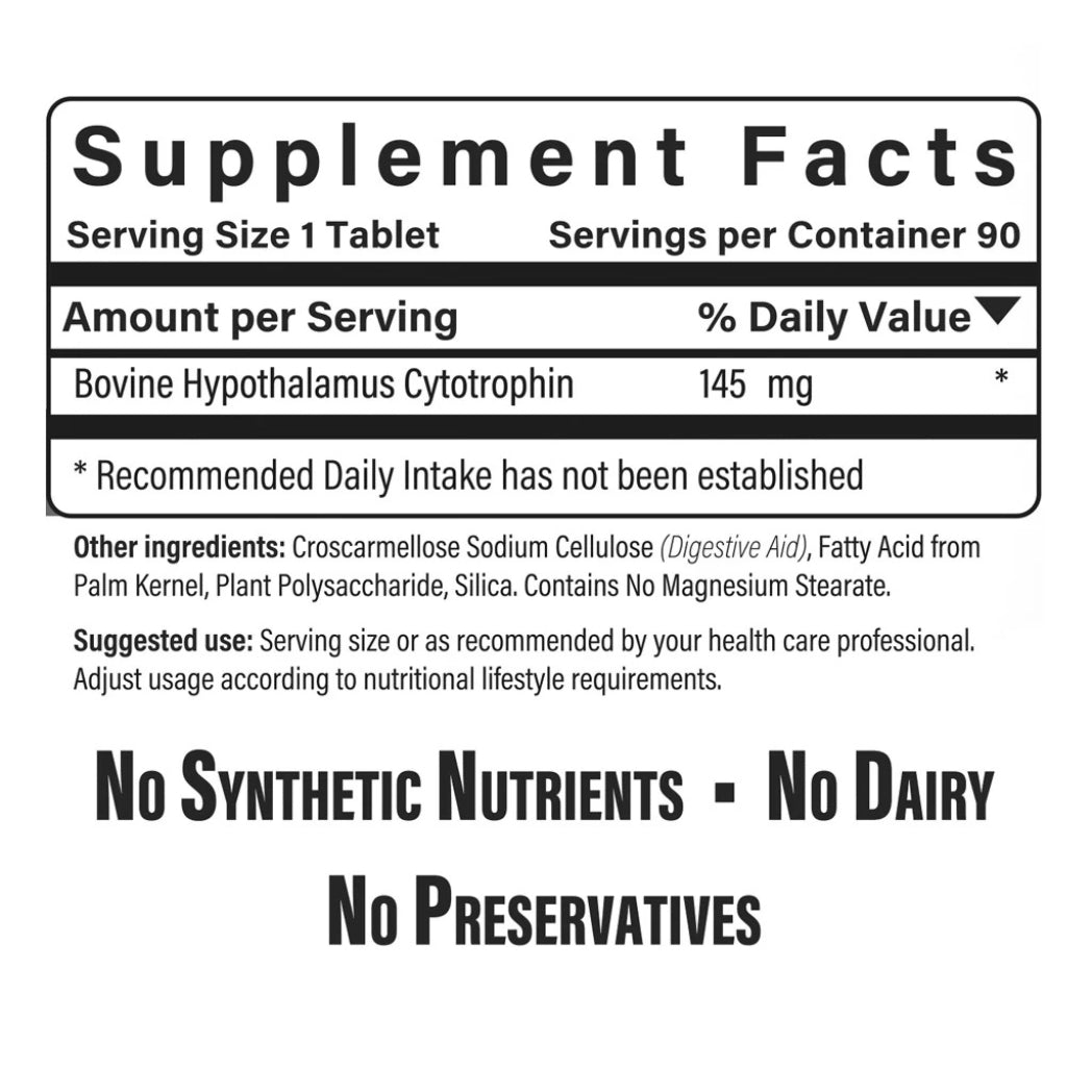 Simply Hypothalamus™ by Doctors Research is a 100% food-based supplement containing 145 mg of Bovine Hypothalamus Cytotrophin per serving. Designed to support and nourish the hypothalamus naturally, it helps promote optimal endocrine system function using only whole food nutrients with no synthetic additives.