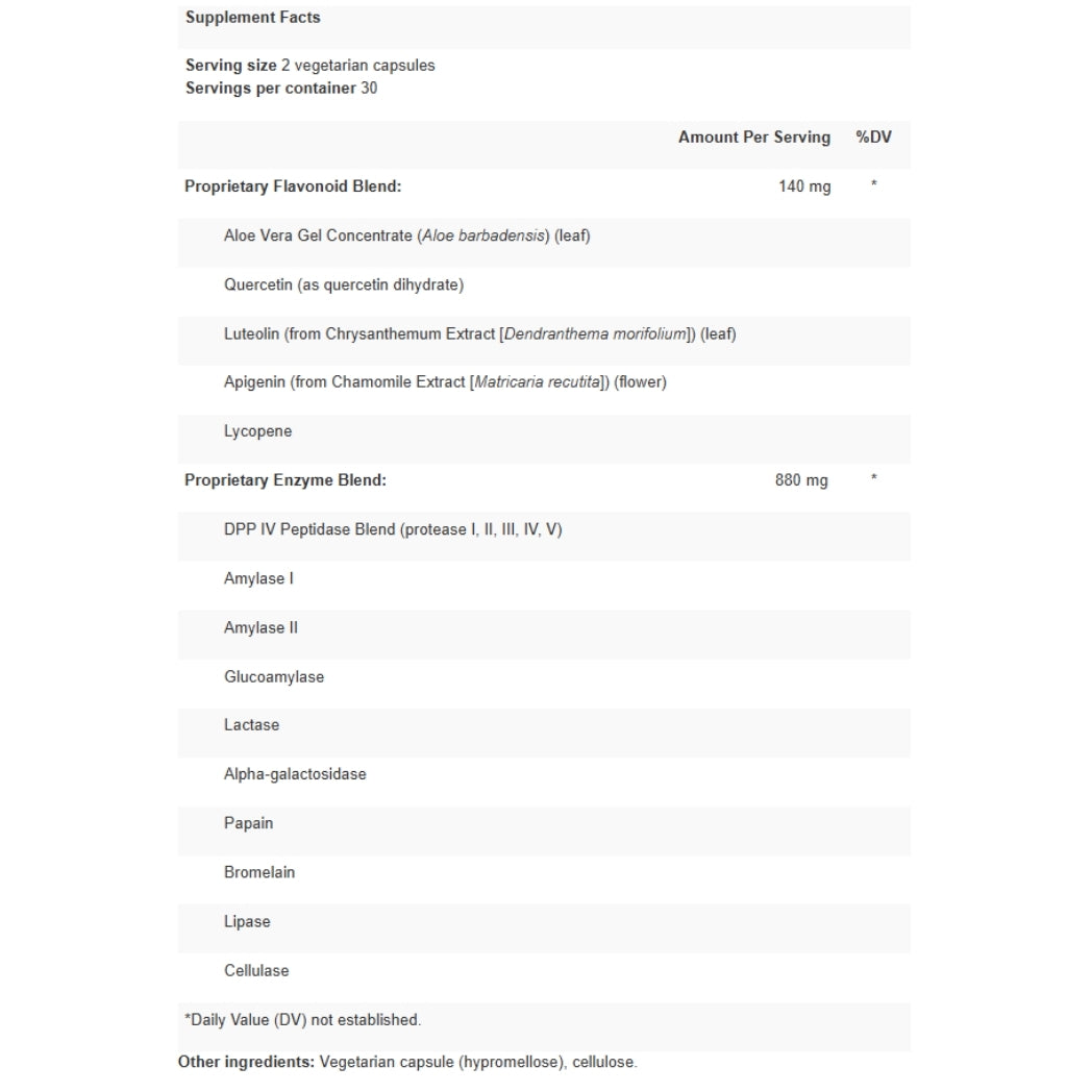 It delivers therapeutic levels of DPP IV enzymes to break down gluten and casein while soothing flavonoids like quercetin, luteolin, and chamomile enhance intestinal support and immune balance.