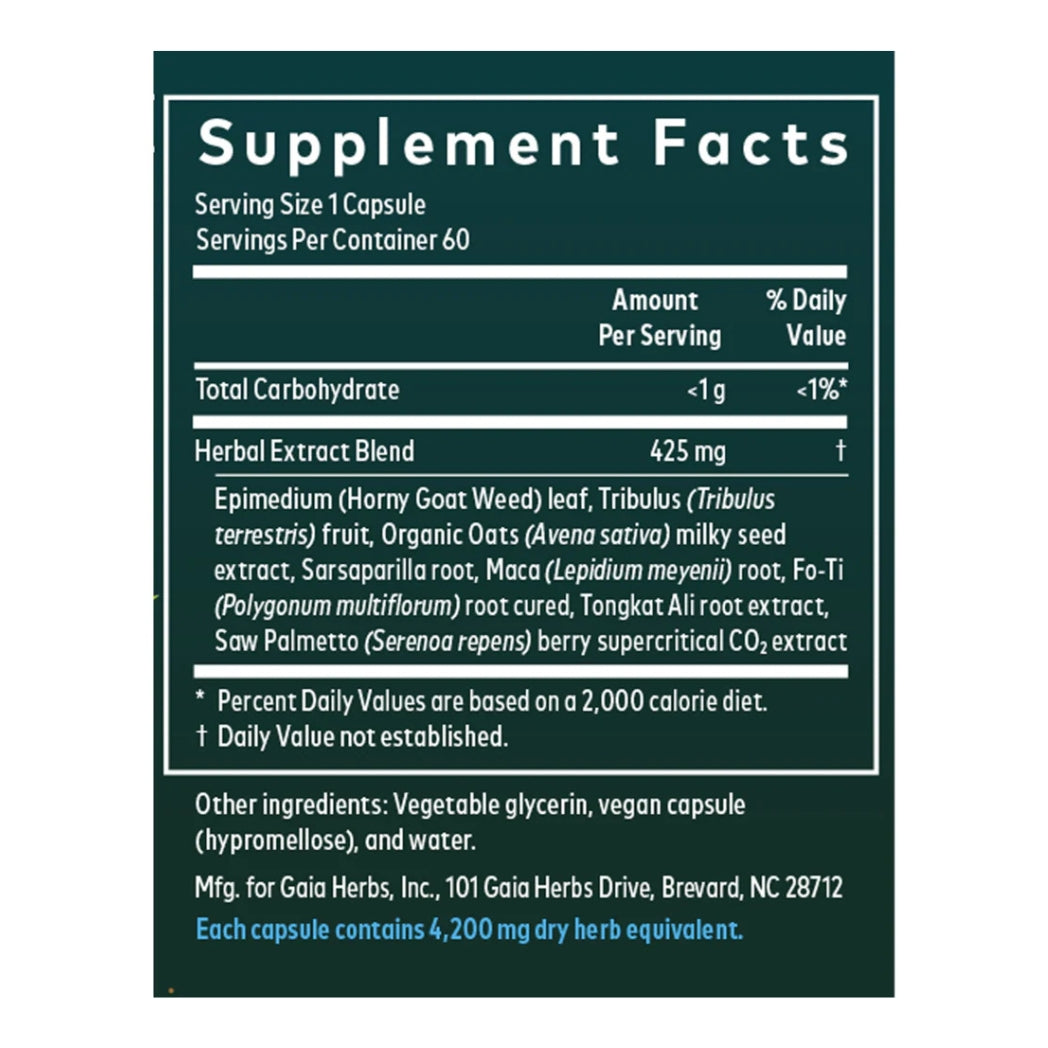 Gaia Herbs Male Libido works by combining time-honored botanicals like Horny Goat Weed, Tribulus, Maca, and Saw Palmetto to naturally encourage a balanced and healthy male hormone profile. These potent herbs provide a synergistic effect to help enhance stamina, desire, and performance.