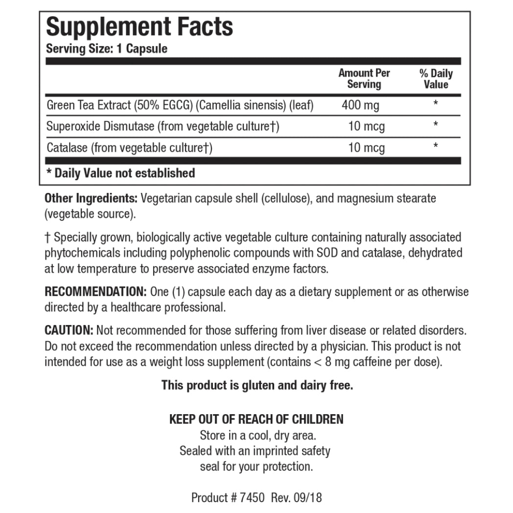 Biotics Research EGCG-200mg delivers 400 mg of potent green tea extract standardized to 50% EGCG, combined with powerful antioxidants Superoxide Dismutase and Catalase to support cellular protection and overall vitality. This formula is designed to support cardiovascular, neurological, and metabolic health while offering antioxidant defense.