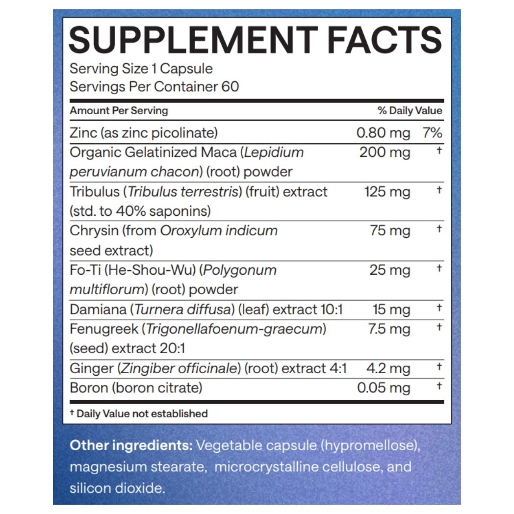Formula 5 features a synergistic combination of botanical adaptogens, antioxidants, and signaling herbs like Tribulus, Tongkat Ali, and Maca to invigorate the HPA axis and enhance testosterone signaling. Carefully selected ingredients support resilience, hormone metabolism, and vitality without overstimulating the system.