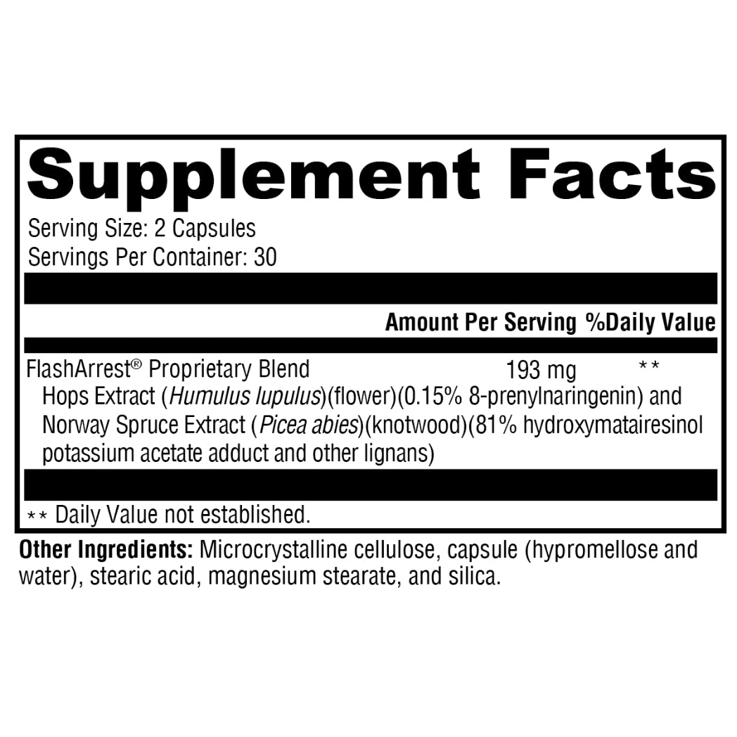 FlashArrest® uses a proprietary blend of standardized hops and Norway spruce extracts rich in phytoestrogens and lignans to help regulate estrogen receptor activity without synthetic hormones.