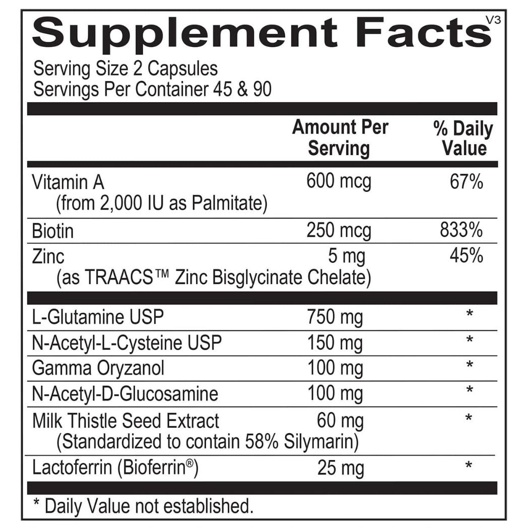 Mucosagen works by combining key nutrients like L-glutamine and N-acetylcysteine to fuel the repair and integrity of the gut mucosa, while milk thistle and zinc support detox pathways and immune balance.* The inclusion of lactoferrin and gamma oryzanol further enhances inflammatory control and mucosal protection