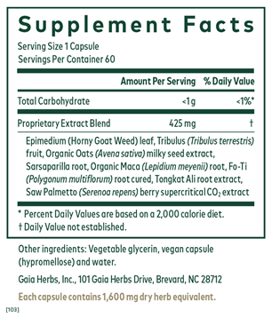 Circulation & Performance Support* A healthy libido is vital to an optimal quality of life.* It can also be reflective of heart health, as both depend on healthy blood flow. Gaia Herbs Stamina & Libido Formula supports stamina and optimizes performance.* With botanicals such as Maca, Tribulus, Horny Goat Weed, and Saw Palmetto, this formula nourishes the male body and optimizes menís health and vitality.